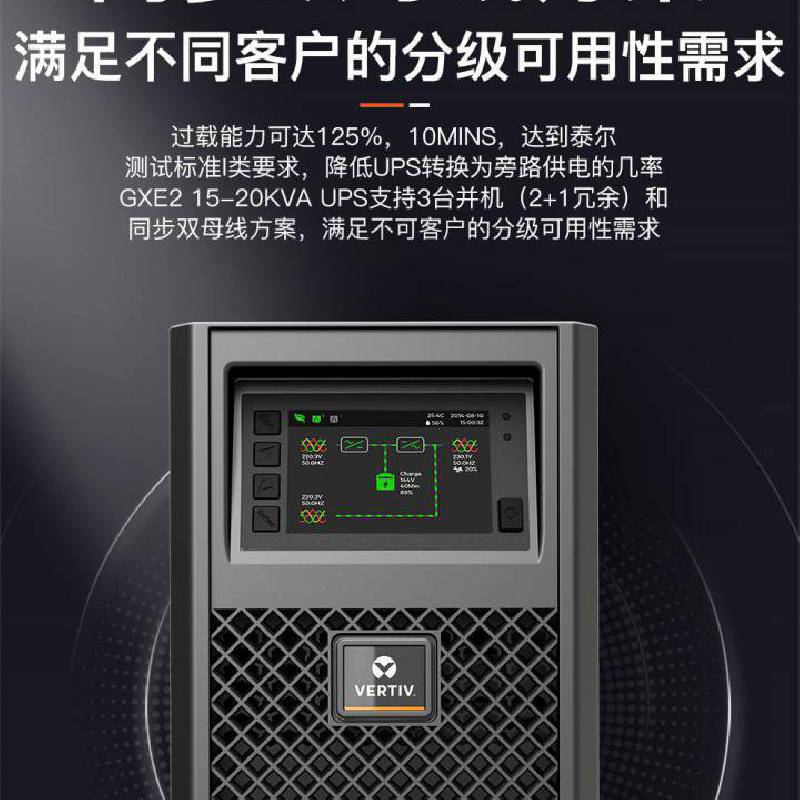 Vertiv Liebert ?GXE2是一款高效、小巧、简便的小型高***塔式UPS,带给您***的供电保障体验。GXE2在上一代产品的 基础上进一步提升了效率、优化了结构、延展了容量、简化了操作和安装,适用于中小型IT机房、网络通信、自动控制、边缘计 算、智慧社区、智慧城市、设备配套等场景,是美好的数字*里*佳的供电保障。